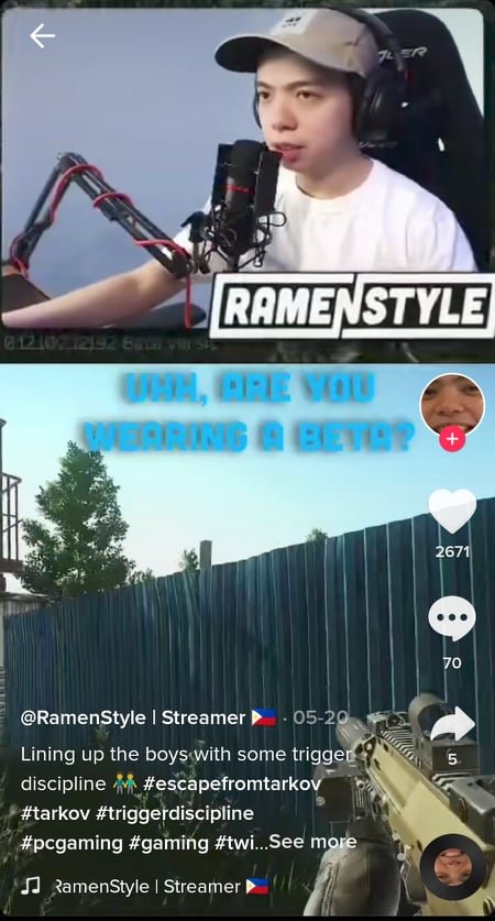 As a full-time gaming streamer, RamenStyle PH streams live on his channel daily, then shares highlights and key moments from his game on his TikTok account. Playing mainly first-person shooter and survival games, with Escape from Tarkov as his current main game, he meticulously describes what happens in the game, and with his character, and also uses creative editing tools to improve his content.