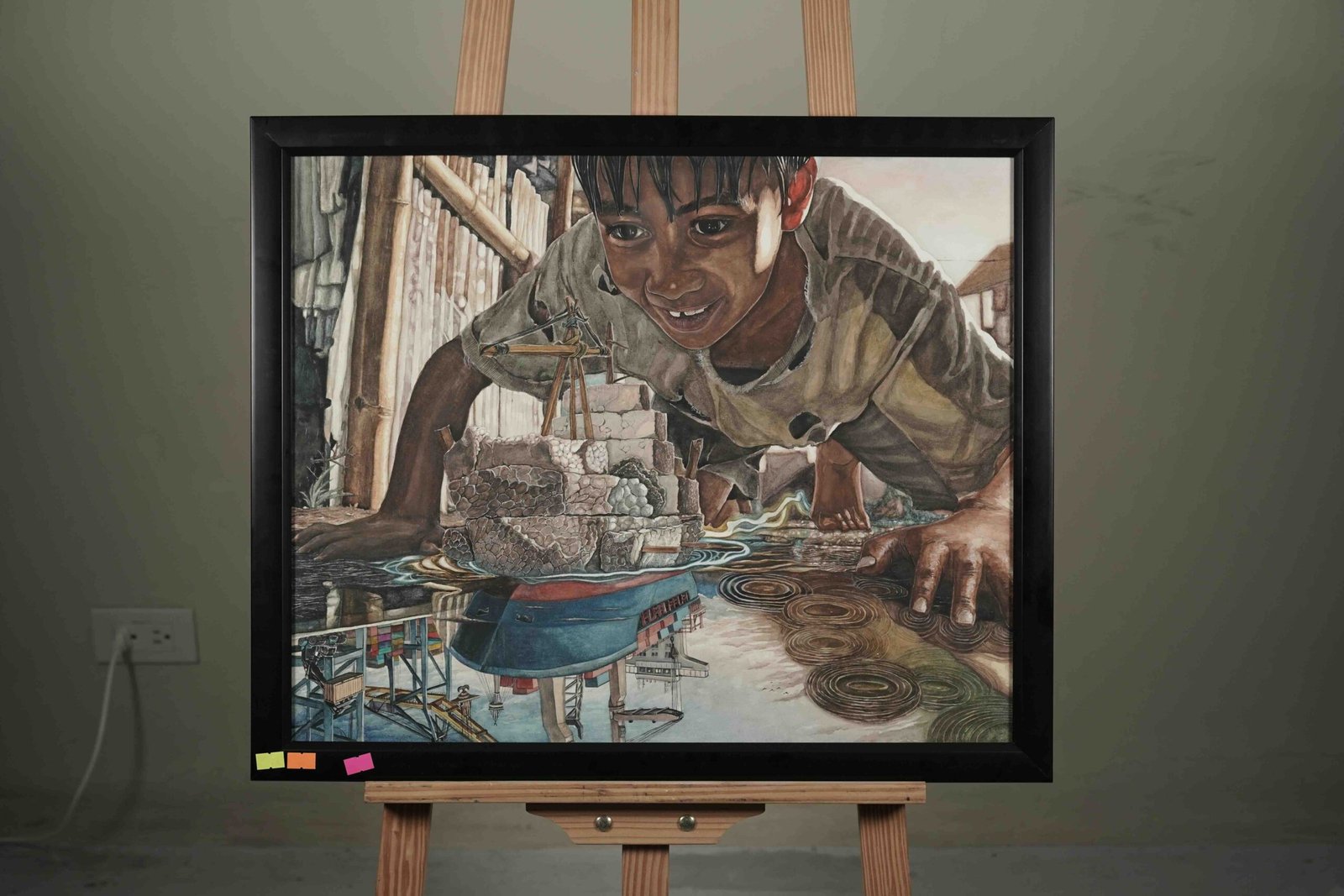 The first-place winner in the Watercolor category is “Odyssey of the Scrap Mariner” by Jonnas Almazar of Bataan Peninsula State University. Moreover, the artwork shows how a child’s simple scrap-made toy boat becomes a grand vessel through imagination.