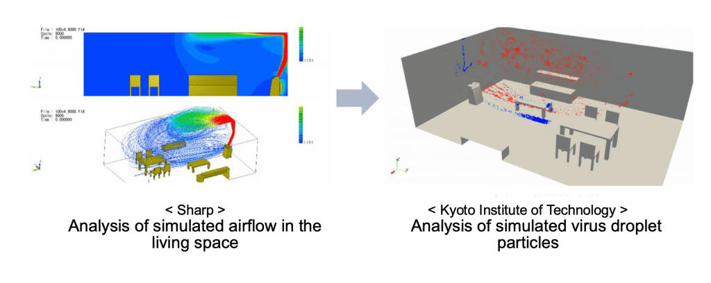 They also calculated the speed and direction of the airflow of air conditioners and air purifiers and analyzed its movement in a living space under simulated usage. Yamakawa analyzed the movement (collection to equipment, adhesion to the surroundings) when virus droplets were released. Here’s a model of Sharp’s simulation together with Professor Yamakawa’s analysis.