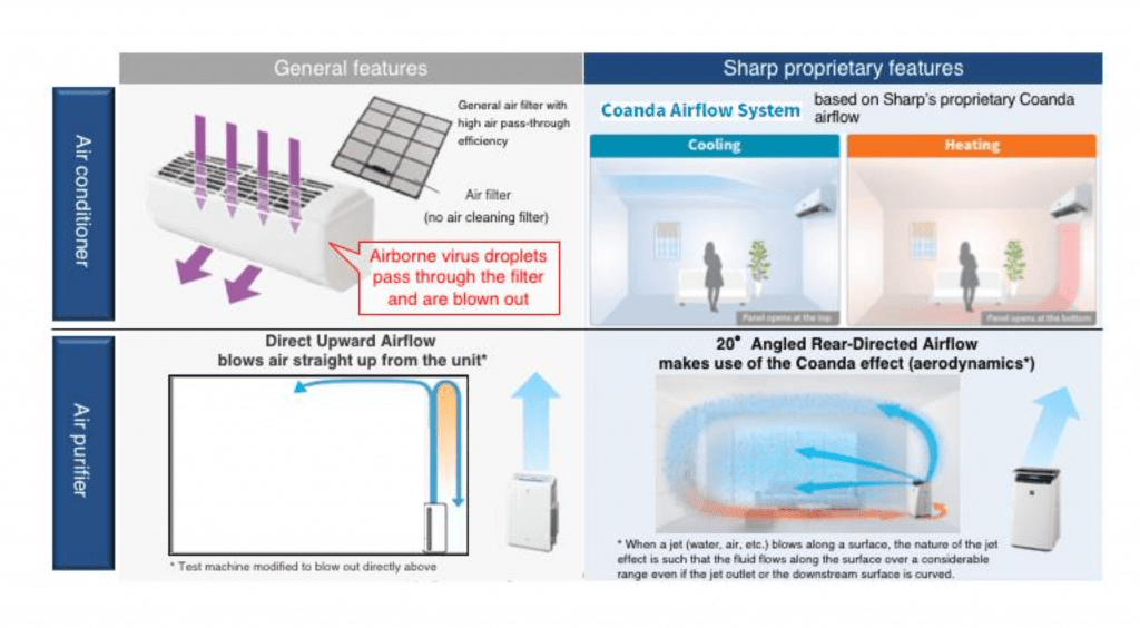 The same thing happens with Sharp proprietary airflow air conditioner versus a traditional one. For the regular air conditioner, the airborne virus droplets are carried on air currents and drawn into the air conditioner so they are not captured. These droplets are diffused again into the room on the air flowing out from the air conditioner.