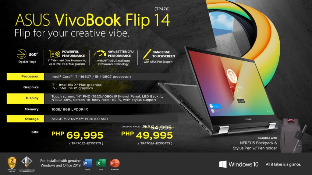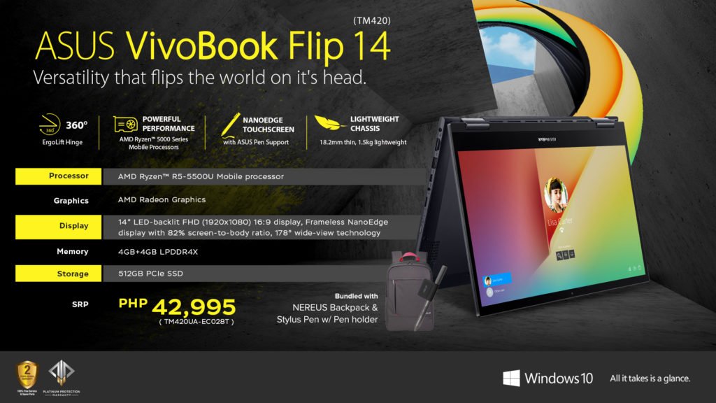 The ASUS VivoBook Flip 14 (TP470) powered by the latest 11th Gen Intel Core processor costs just Php 69,995 for the i7 variant and Php 49,995 for the i5 variant. The ASUS VivoBook Flip 14 (TM420), on the other hand, remains powered by the latest AMD Ryzen R5-5500U mobile processor at the price of just Php 42,995. Both laptops come bundled with ASUS Nereus Backpack and ASUS Pen with magnetic holder. The ASUS VivoBook Flip series now became available in your nearest ASUS Concept Stores nationwide as well as through the official online stores in Lazada, Shopee, and E-store. In case you missed the launch, click here: http://bit.ly/FlipTheFutureLaunch