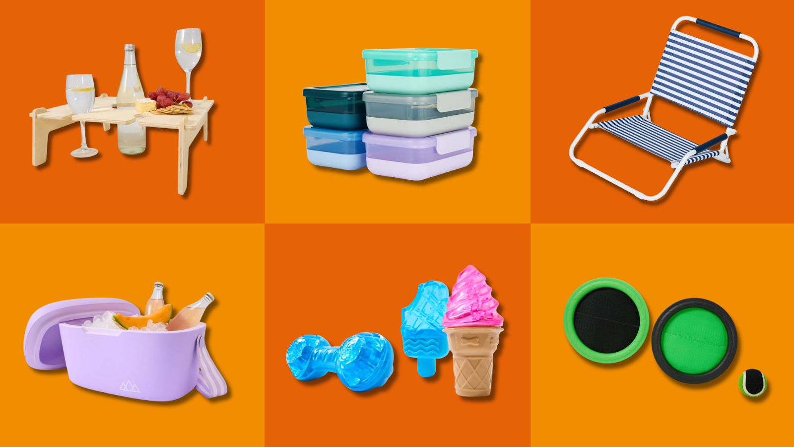Picnic Table (₱660), Large Food Containers (₱1,120), Blue Stripe Chair (₱790), Retro Coolers (₱1,190), Pet Toy Novelty Cooling Set (₱130), and Catch Ball Set (₱290) – Anko