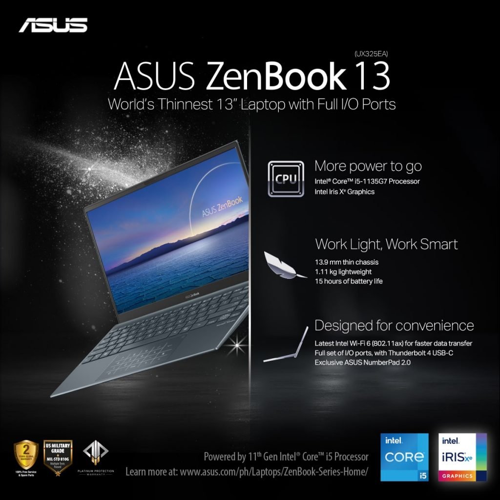 The all-new ASUS ZenBook 13 UX325 is powered with latest 11th Generation Intel® Core™ i5 processors, complemented by the new Intel Iris® Xe integrated graphics, and comes in the sleek and sophisticated Pine Grey color. The latest ZenBook Classic is available starting today in ASUS Concept Stores and ASUS Official Lazada Store, and is priced at just Php 54,995.
