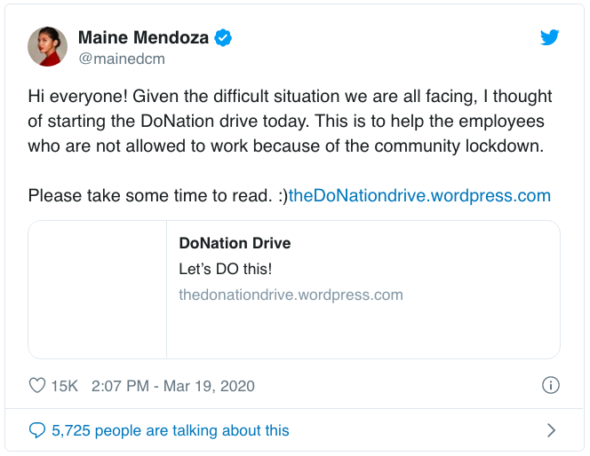 Phenomenal Star Maine Mendoza used her status to spearhead the DoNation Drive. This sends financial support to more than 500 families through GCash. The Luzon-wide quarantine has affected and crippled the livelihood of these randomly-picked families.