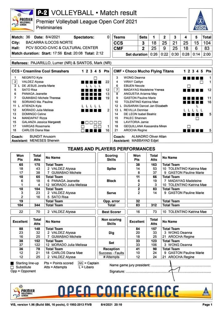 The game finished after five sets recording 18-25, 25-9, 21-25, 25-18, 15-6 favored Creamline. Choco Mucho excitingly claimed the first set. However, Cool Smashers cut the momentum and had a comeback with amazing offenses and defenses. Making a large gap with 16 points.