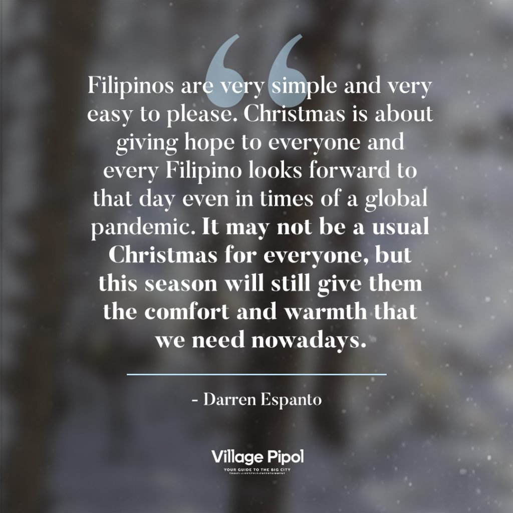 “Filipinos are very simple and very easy to please. Christmas is about giving hope to everyone and every Filipino looks forward to that day even in times of a global pandemic. It may not be a usual Christmas for everyone, but this season will still give them the comfort and warmth that we need nowadays.