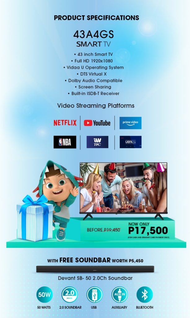 Just how great is the Hisense Birthday Blowout deal? For only PHP 17,500, you get a 43” Hisense Smart TV plus a free soundbar! It’s that awesome!