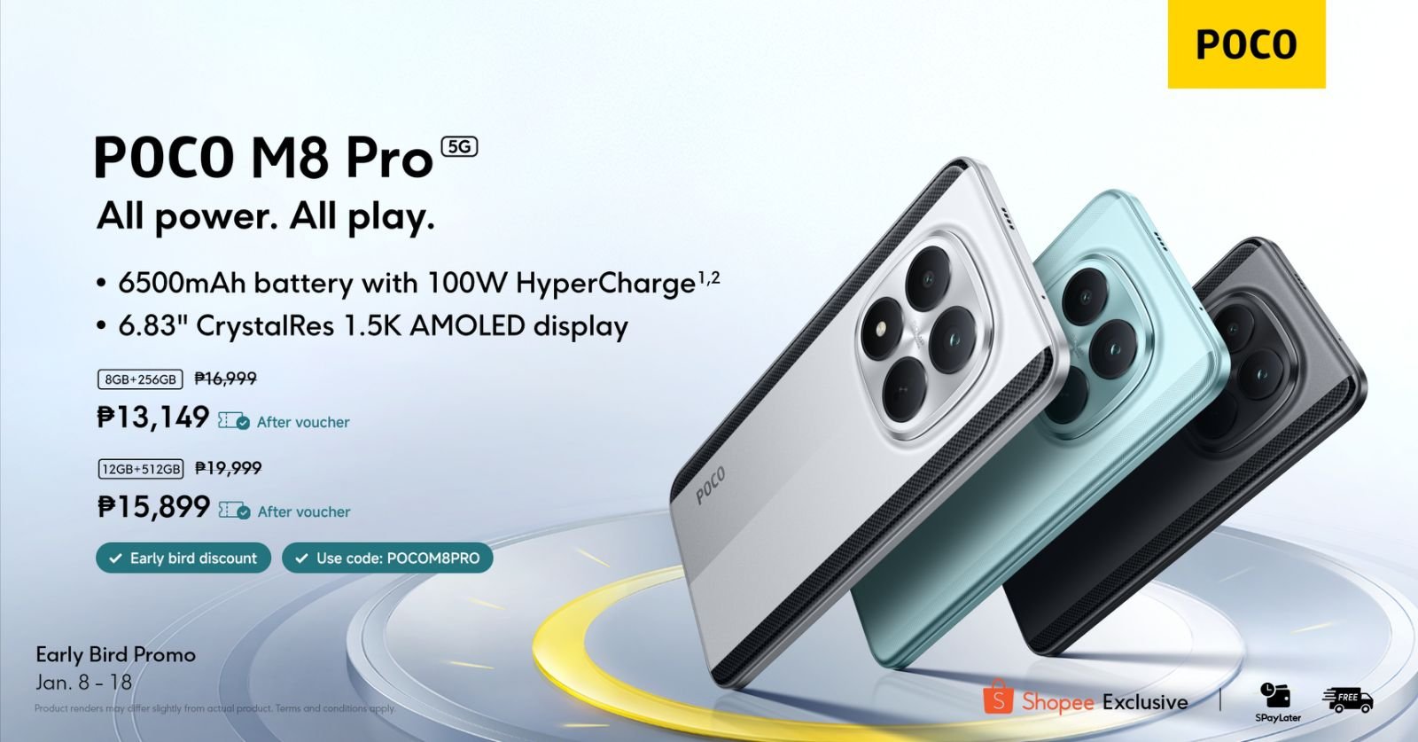 The POCO M8 Series is exclusively available on Shopee. To learn more about the POCO M8 Series, visit http://mi.com/ph.