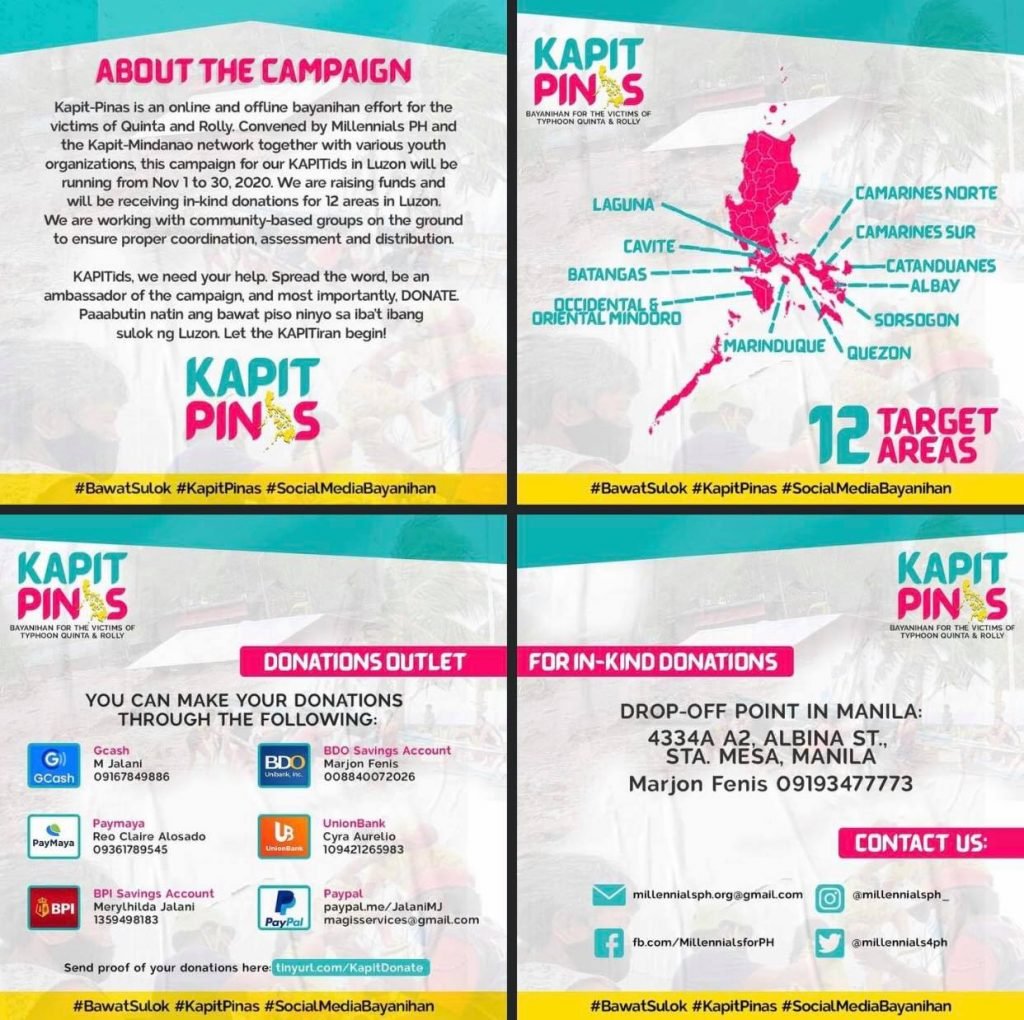 Convened by advocacy-based group Millennials PH and the Kapit-Mindanao network, the campaign will be running from November 1 to 30, 2020. People can course their cash donations online or drop off in-kind goods at designated points. The campaign will benefit 12 target areas that were badly affected by the onslaught of these typhoons, namely, Camarines Norte, Camarines Sur, Albay, Sorsogon, Masbate, Catanduanes, Marinduque, Quezon, Oriental and Occidental Mindoro, Batangas, Cavite, and Laguna.