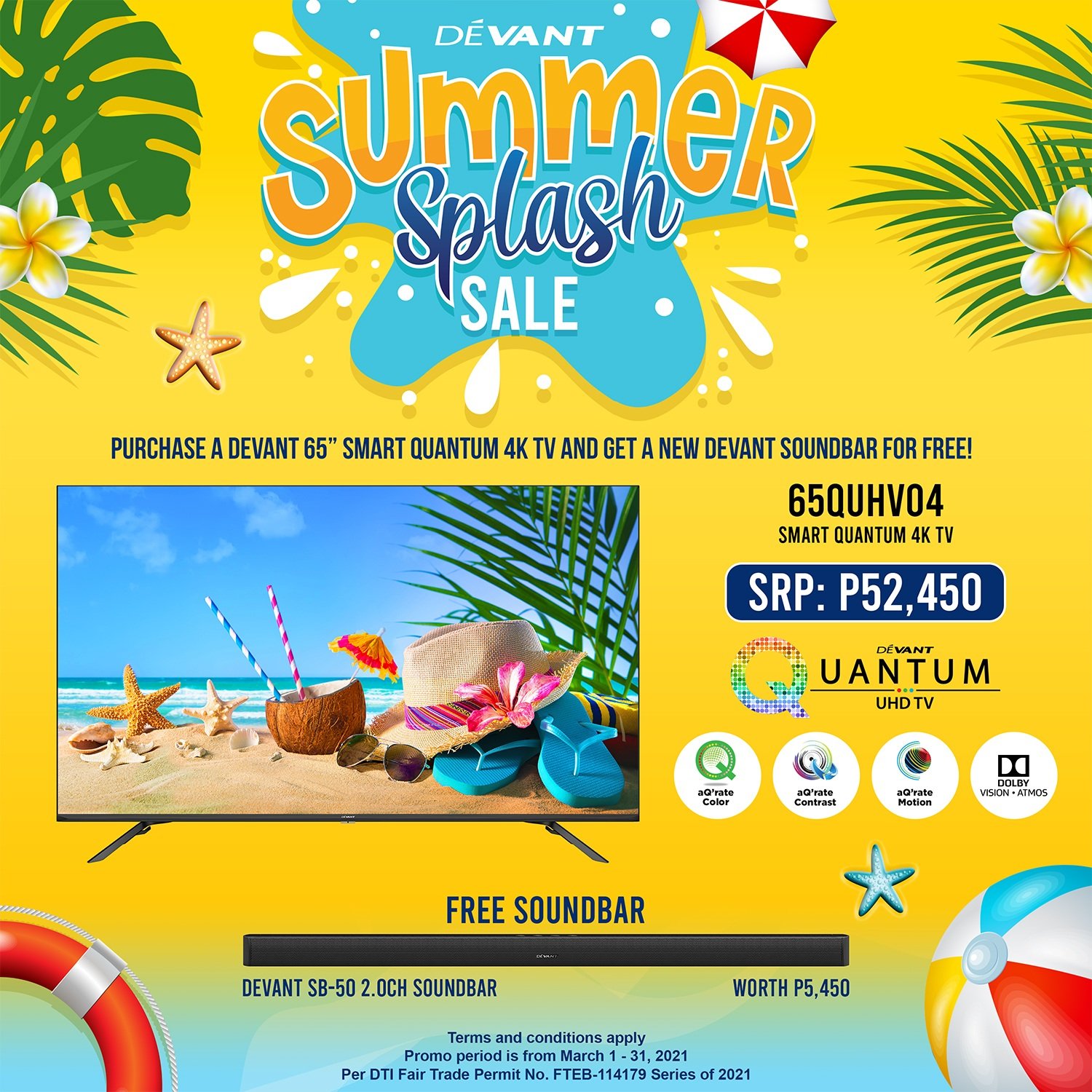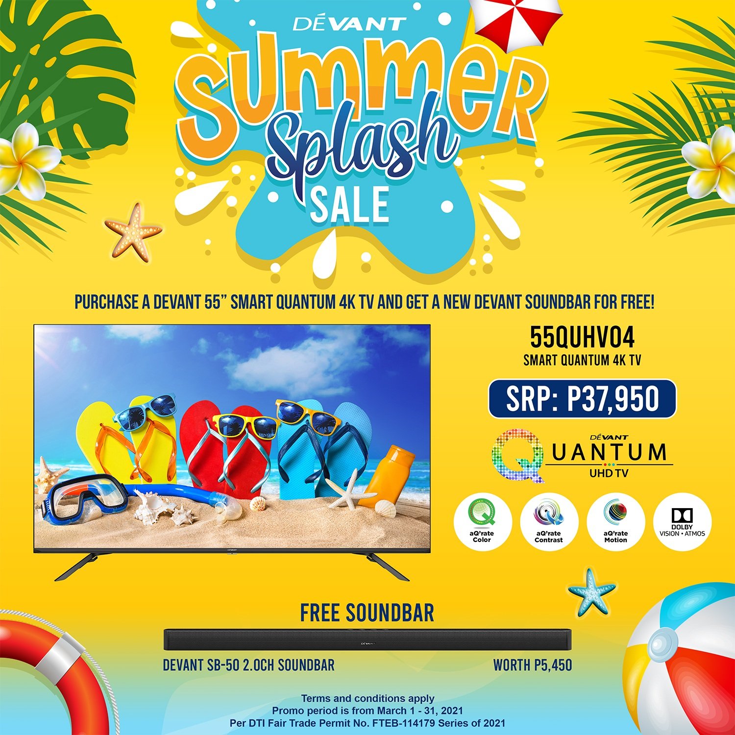 Upgrade to an awesome Smart Quantum 4K TV at the Devant Summer Splash Sale, and get a new Devant Soundbar for free! The Devant Summer Splash Sale runs until March 31, 2021 in Devant’s Official Flagship Stores in Lazada (https://bit.ly/DevantLaz9) and Shopee (https://bit.ly/DevantShp9), and in participating retail stores.