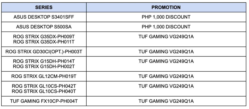Both ASUS and ROG will be including their desktop products in the promotion. ROG desktops such as the ROG Strix G35DX, Strix GD30CI, Strix GL12CM, Strix GL10CS, Strix G15DH, and TUF Gaming FX10CP can enjoy a high refresh rate gaming with its bundled ASUS TUF Gaming VG249Q1A that is worth PHP 12,000+.