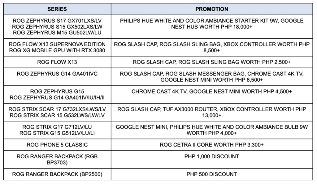 Cutting-edge ROG products, including the first-ever convertible gaming laptop, the ROG Flow X13 will be joining the fun together with the award-winning Zephyrus G14 and G15 and the esports-ready ROG Strix laptops. Buyers are sure to enjoy awesome bundle items that range from Google Nest products, Chromecast 4K with Google TV, Philips Hue Ambiance series, Xbox Controllers, TUF AX3000 Wifi Router, and the most sought-after exclusive ROG Slash Collection.