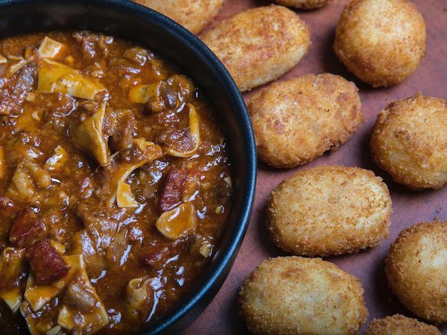 Permeated with thick, smoky, paprika-enriched sauce, and the perfect amount of spice, the pork oreja and chunks of chorizo just melts in my mouth. Sería perfecto con vino (It would be perfect with wine).