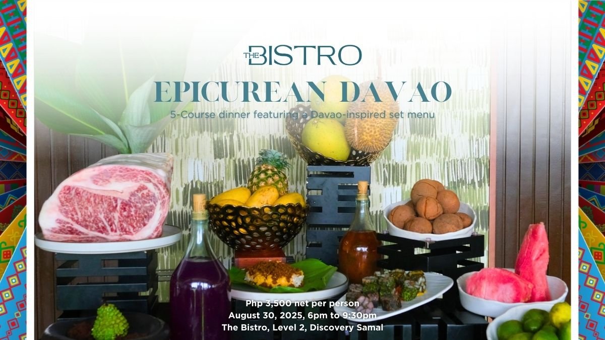 The Bistro’s Kadayawan Learn and Dine will take place on August 30, 2025, from 6pm to 9pm at Discovery Samal. For reservations and inquiries, please contact fb@discoverysamal.com.