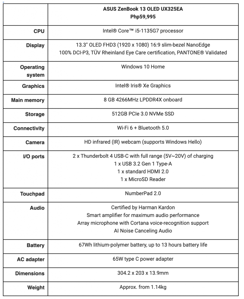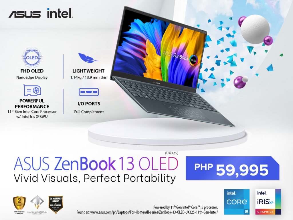 ASUS ZenBook 13 OLED, tagged as the world’s thinnest OLED laptop, is available in Pine Grey color, equipped with the latest 11th Generation Intel® Core™ i5 processor, Intel® Iris® Xe Graphics, with 8GB memory, 512GB SSD storage, and exclusive out of the box bundled items is priced at P59,995.