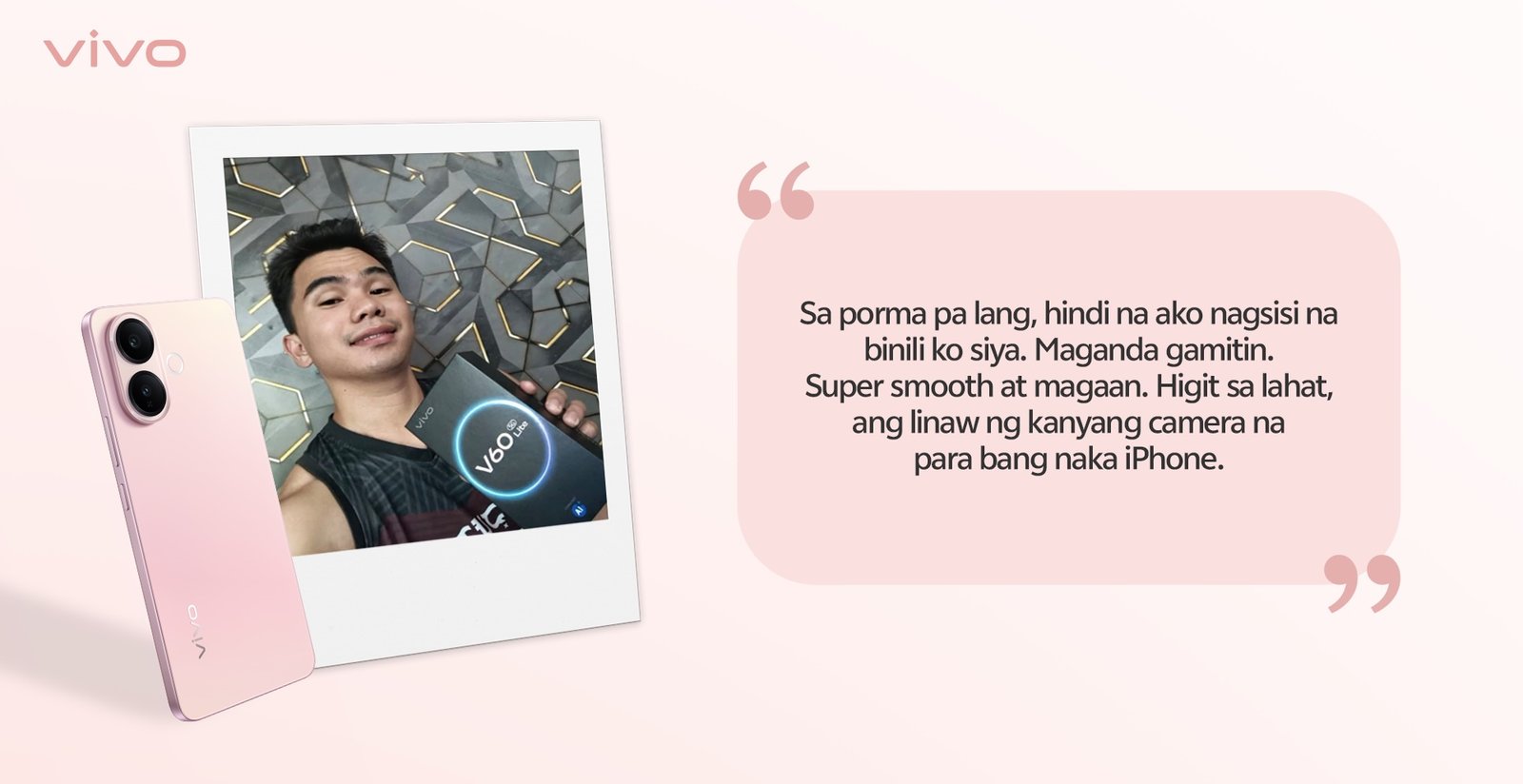 Adding to the growing list of satisfied users, Rashen Lapasanda, a student from Leyte, also shared how the vivo V60 Lite in Pop Pink exceeded his expectations.